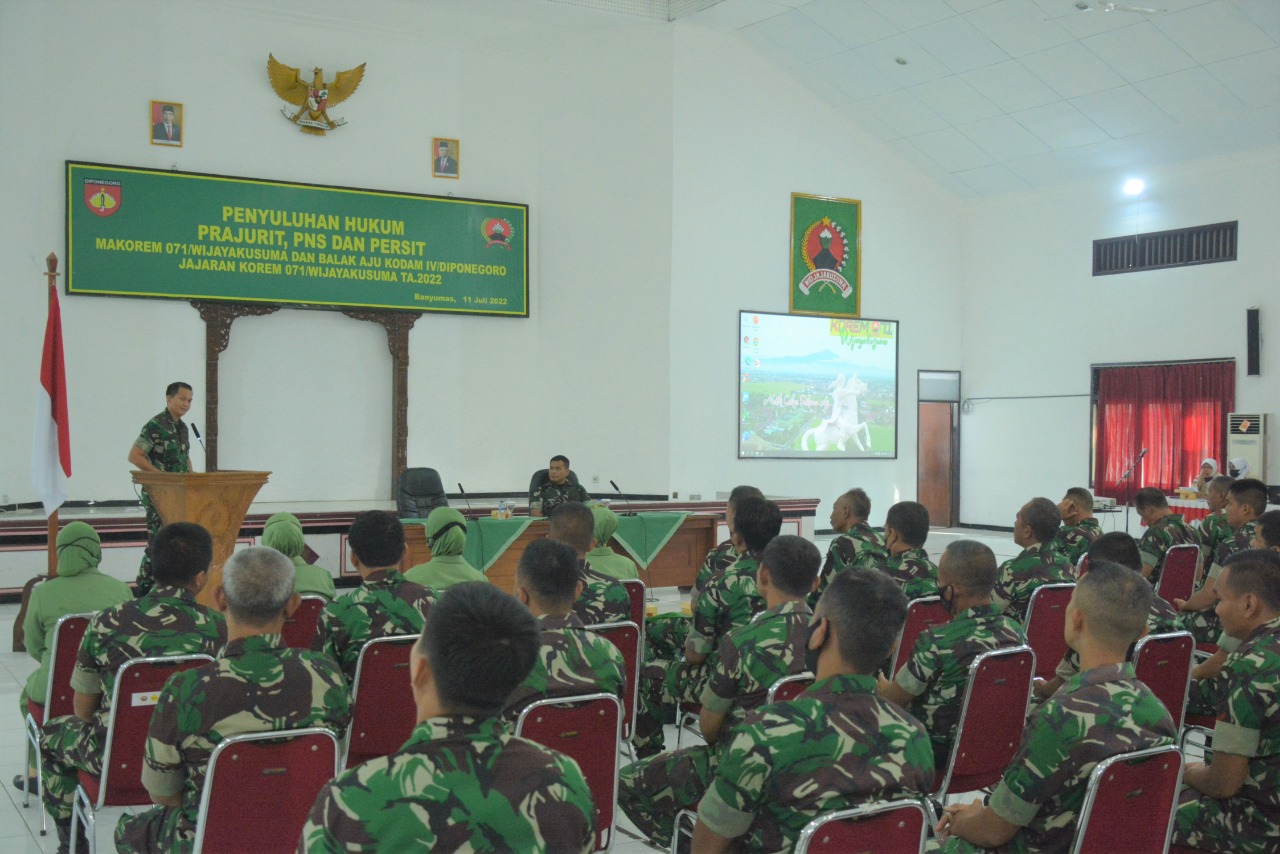 Banyumas – Guna untuk mengeliminir dan meminimalisir pelanggaran serta meningkatkan kesadaran hukum bagi personelnya dan keluarga besarnya, Korem 071/Wijayakusuma suluh prajurit dan PNS serta anggota Persitnya melalui gelar Penyuluhan Hukum, Senin (11/7/2022) di Gedung Pertemuan A. Yani Makorem 071/Wijayakusuma, Sokaraja, Banyumas.