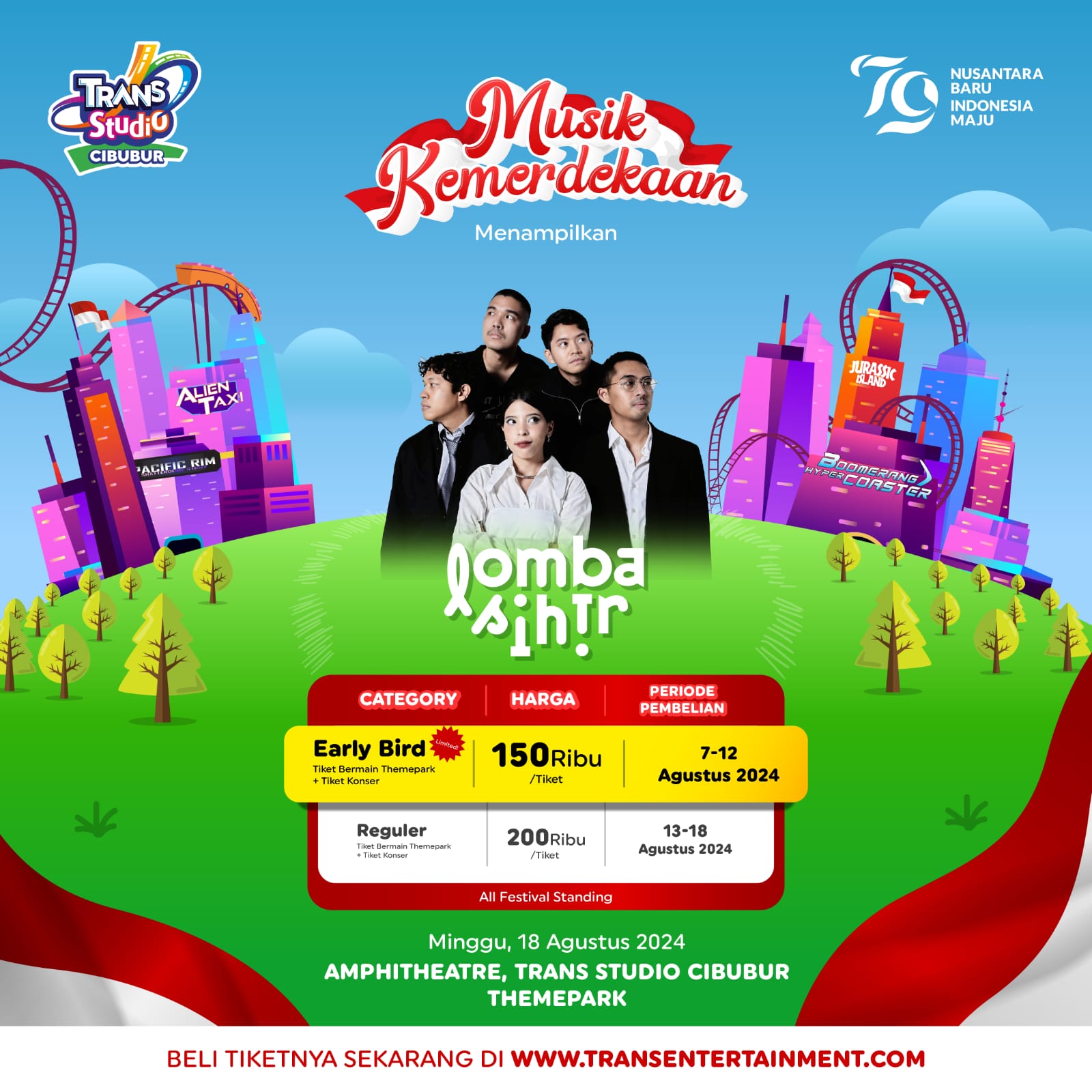 Dalam rangka perayaan Dirgahayu Republik Indonesia yang ke-79, Trans Studio Cibubur kembali mempersembahkan acara spesial dalam rangka merayakan hari kemerdekaan untuk bersama- sama bersuka cita dan menciptakan momen spesial liburan di bulan agustus dengan nuansa yang berbeda dalam tajuk “Musik Kemerdekaan” yang diselenggarakan langsung pada Minggu, 18 Agustus 2024 hanya di Amphitheater Trans Studio Cibubur.