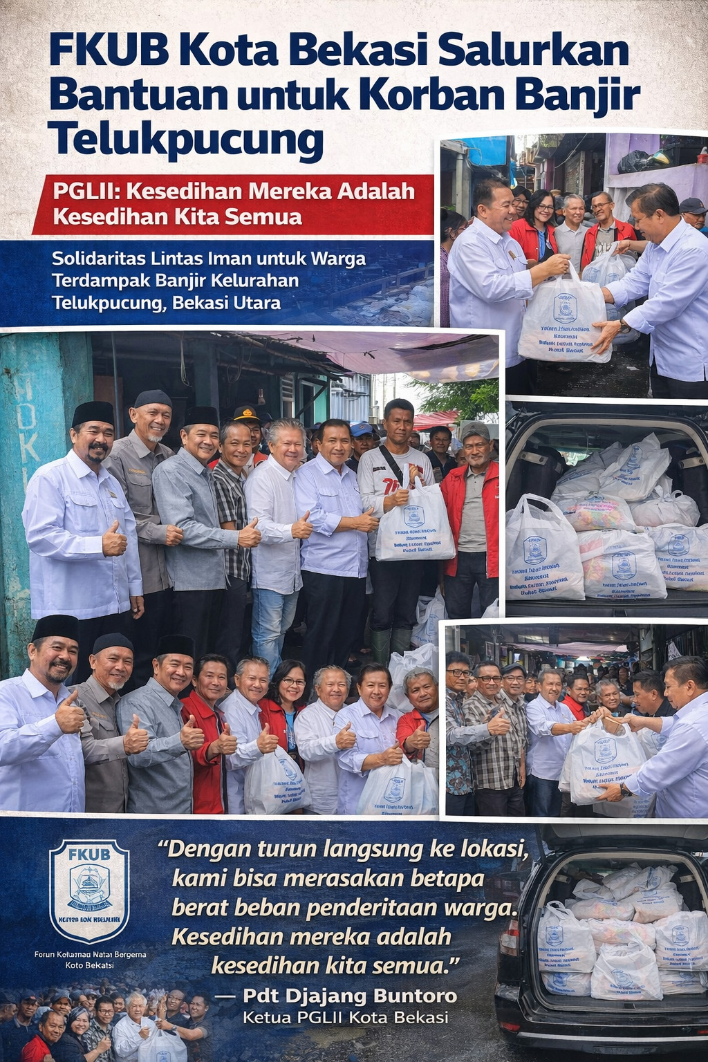 Kota Bekasi — Solidaritas lintas iman kembali ditunjukkan di Kota Bekasi. Forum Kerukunan Umat Beragama (FKUB) Kota Bekasi bersama Persekutuan Gereja-Gereja dan Lembaga-Lembaga Injil Indonesia (PGLII) Kota Bekasi, Parisada Hindu Dharma Indonesia (PHDI) Kota Bekasi, serta Asosiasi Pendeta Indonesia (API) Kota Bekasi turun langsung ke wilayah terdampak banjir di Kelurahan Telukpucung, Kecamatan Bekasi Utara, Jumat (30/1/2026).