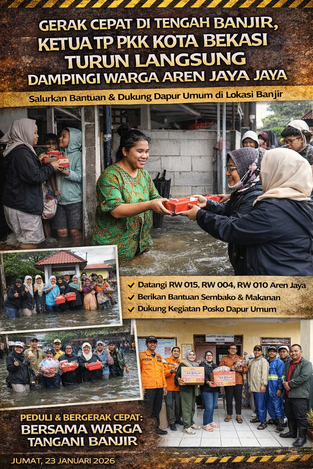 Kota Bekasi – Di tengah genangan banjir yang melanda sejumlah wilayah, Ketua Tim Penggerak PKK Kota Bekasi, Wiwiek Hargono Tri Adhianto, menunjukkan kepemimpinan yang responsif dengan turun langsung ke lapangan. Pada Jumat (23/1/2026), ia menyusuri kawasan terdampak banjir di Kelurahan Aren Jaya untuk memastikan kondisi warga sekaligus menyalurkan bantuan kemanusiaan.