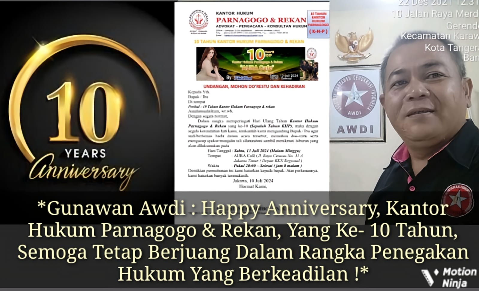 Bersama ini Kepala Penerbitan Lembaga Organisasi Asosiasi Wartawan Demokrasi Indonesia AWDI ” Gunawan Mengucapkan “Selamat Anniversary Kantor Hukum Parnagogo & Rekan yang ke-10 Tahun” Semoga masyarakat merasakan manfaat atas pelayanan prima kantor Hukum Parnagogo & Rekan dalam rangka pendampingan penegakan hukum yang menjunjung tinggi nilai-nilai keadilan.