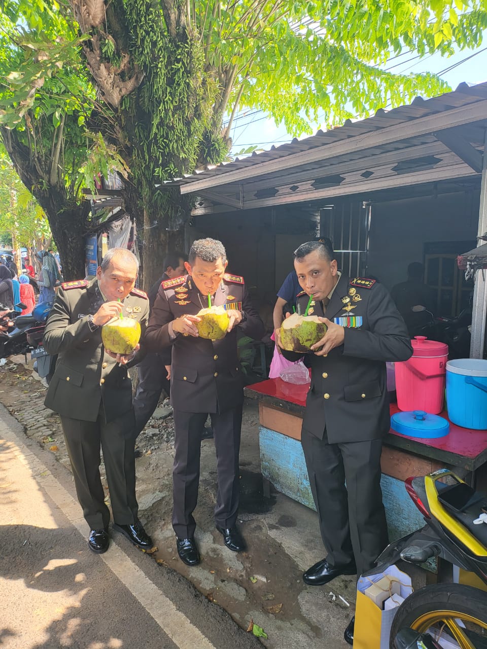 Tak sungkan-sungkan, mereka bertiga bersama-sama meminum kelapa muda berdampingan, di depan warung kaki lima dengan masih berpakaian seragam lengkap masing-masing.