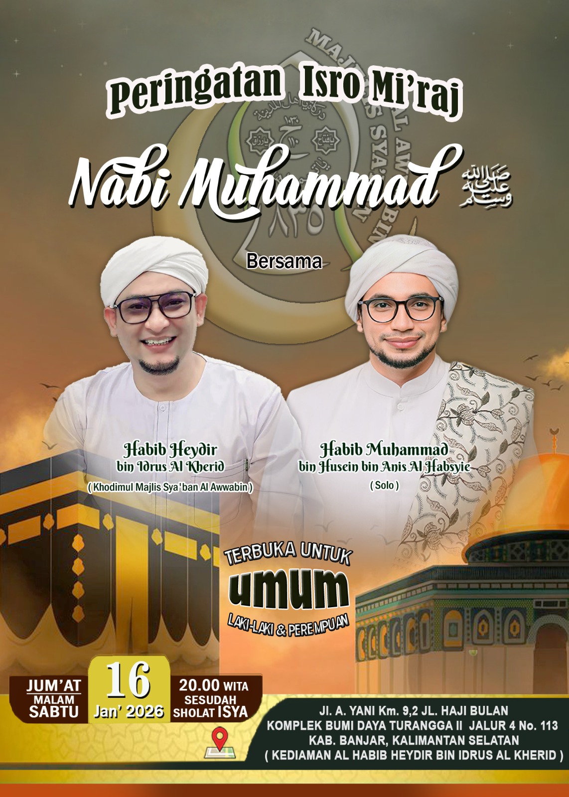 Acara terbuka untuk umum pada Jumat malam 16 Januari 2026/ Pada Pukul 20.00 WITA ‘ Setalah Sholat Isya di kediaman AL HABIB HEYDIR BIN IDRUS AL KHERID yang beralamat di Jalan A.Yani Km.9,2 /