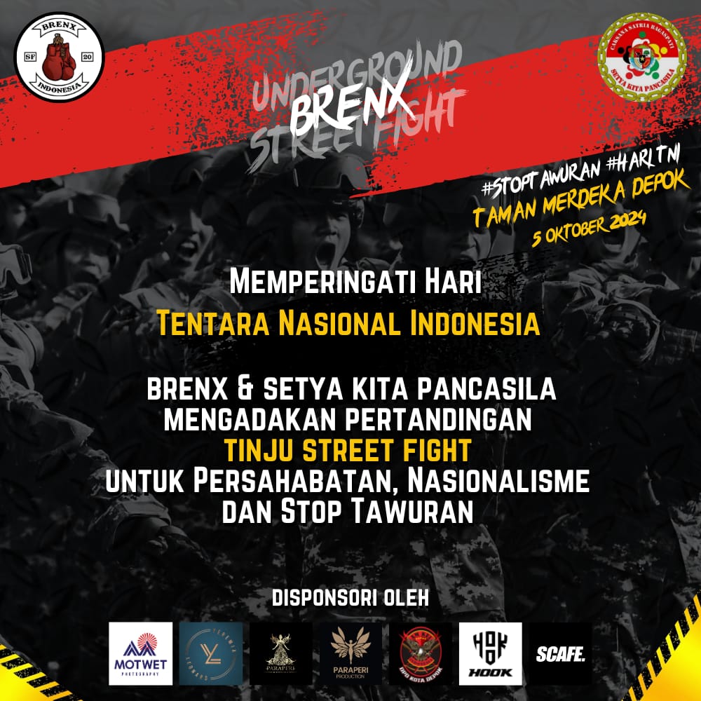 Depok – Ormas Belanegara Setya Kita Pancasila melalui Sayap Organisasinya “BrenX Indonesia” Mengumpulkan Jago – jago dari berbagai Genk Motor dan Ormas – ormas se Jabotabek untuk menggelar Perang tanding “Tinju Street Figth” yang diselenggarakan di Taman Merdeka Kota Depok pada tanggal 05 Oktober 2024…..