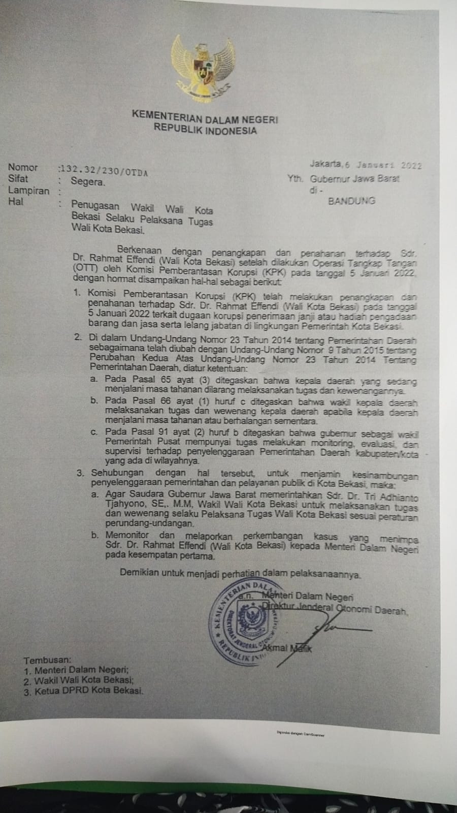 “Jadi hari ini Bapak Wakil Walikota Bekasi dipanggil ke Bandung karena kami tadi menyerahkan surat pengangkatan beliau sebagai Plt. Walikota Bekasi. Dengan surat itu maka beliau bisa melakukan pelayanan publik, serta menandatangani dokumen, serta hal yang bersifat hukum karena tidak boleh ada kekosongan hukum,” ucap Ridwan Kamil.