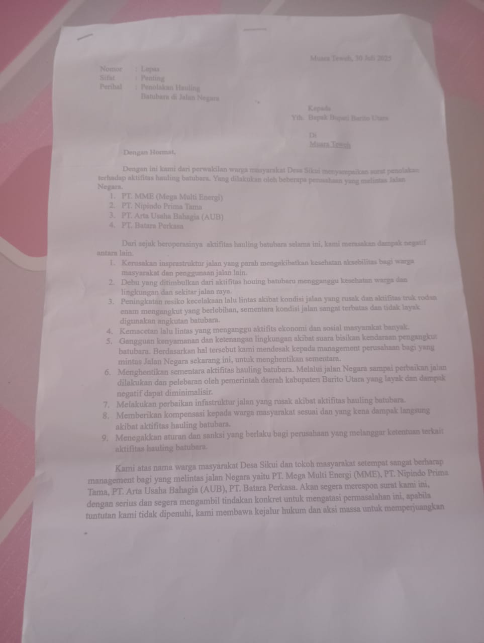 Masyarakat mendesak pemerintah daerah, dinas terkait, serta aparat penegak hukum untuk segera menghentikan aktivitas hauling di jalan umum, melakukan evaluasi perizinan, dan menegakkan aturan agar dampak kerusakan jalan, gangguan kesehatan, serta potensi konflik sosial tidak semakin meluas.