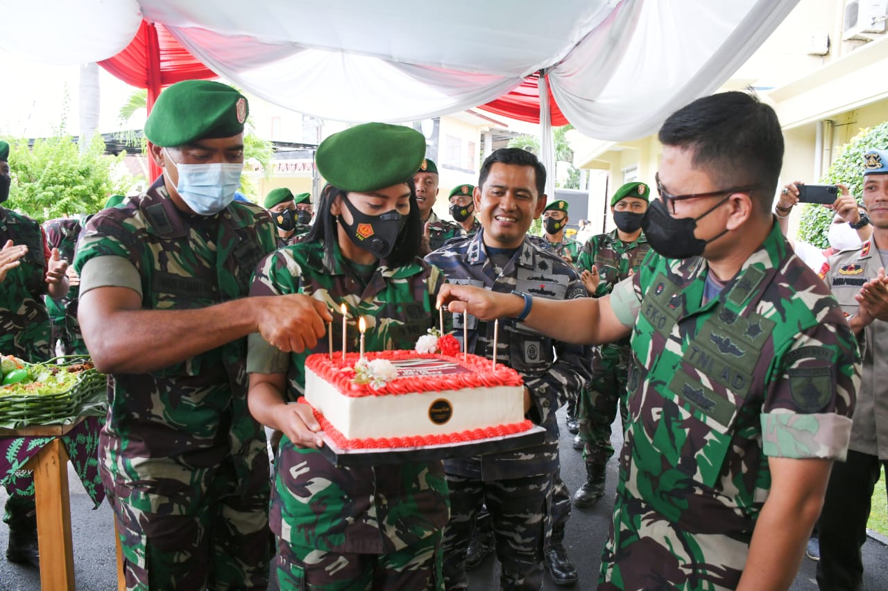 Banyuwangi – Sebagai wujud sinergitas TNI-POLRI, Anggota Kodim 0825/Banyuwangi menyerbu Kantor Polresta Banyuwangi sekaligus memberikan kejutan berupa ucapan selamat atas Dirgahayu Bhayangkara Ke-76 bertempat di Mapolresta Banyuwangi Jalan Brawijaya No. 21 Kelurahan Kebalenan Kabupaten Banyuwangi.(01-06-2022)