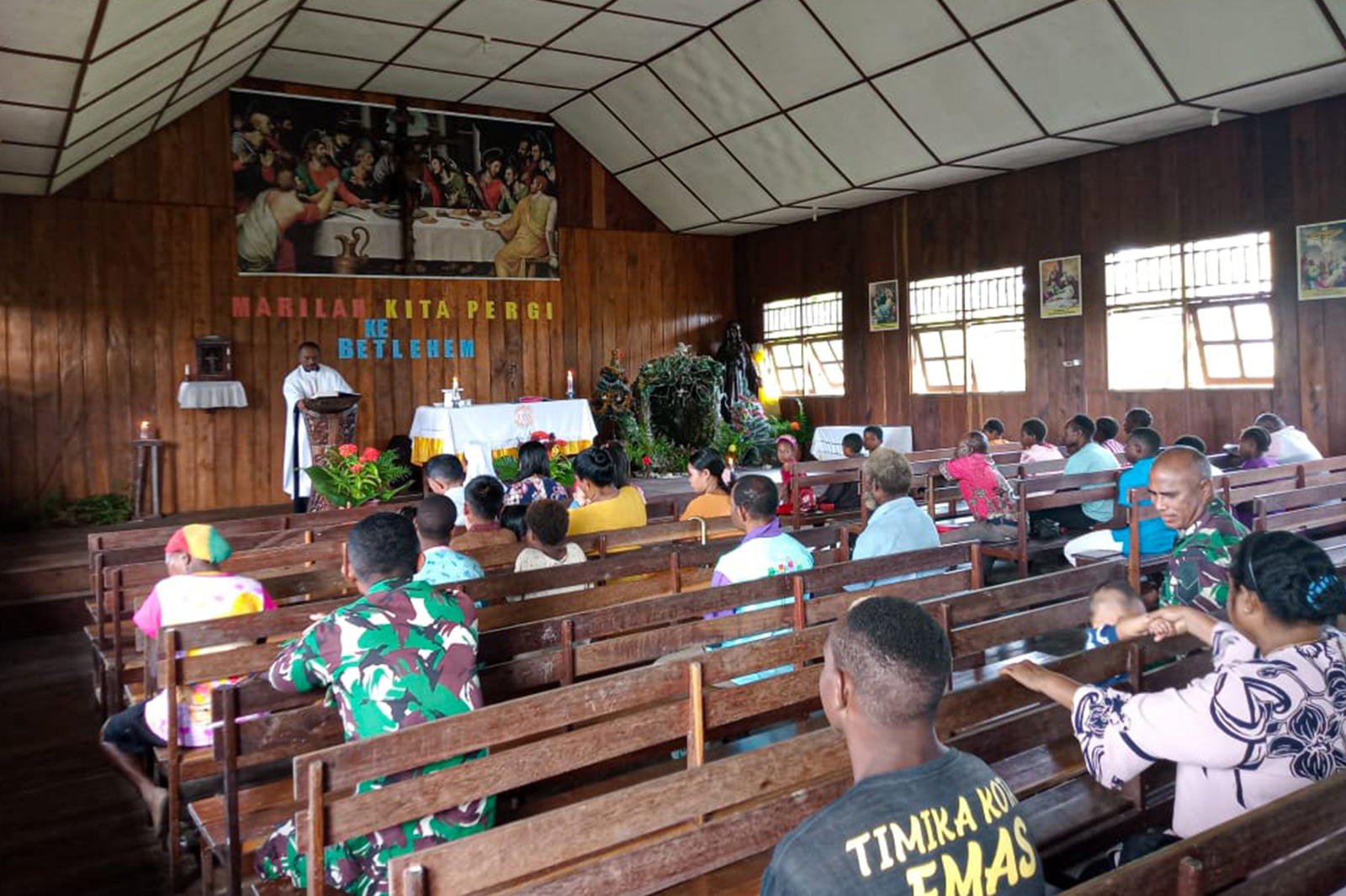 Nduga – Satgas Pamtas Mobile RI-PNG Yonif 503/Mayangkara melaksanakan ibadah minggu Nasrani di Gereja Quasi Paroki Santo Damian bersama warga Batas Batu Kabupaten Nduga Papua. Minggu (05/01/2025).