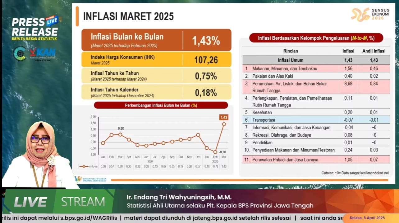 Hal itu disampaikan Plt Kepala BPS Jateng Endang Tri Wahyuningsih, pada rilis daring Selasa (8/4/2025). Dia memaparkan, secara tahunan atau year on year (Y-on-Y) inflasi Provinsi Jawa Tengah sebesar 0,75 persen. Sementara, inflasi year to date sebesar 0,18 persen.