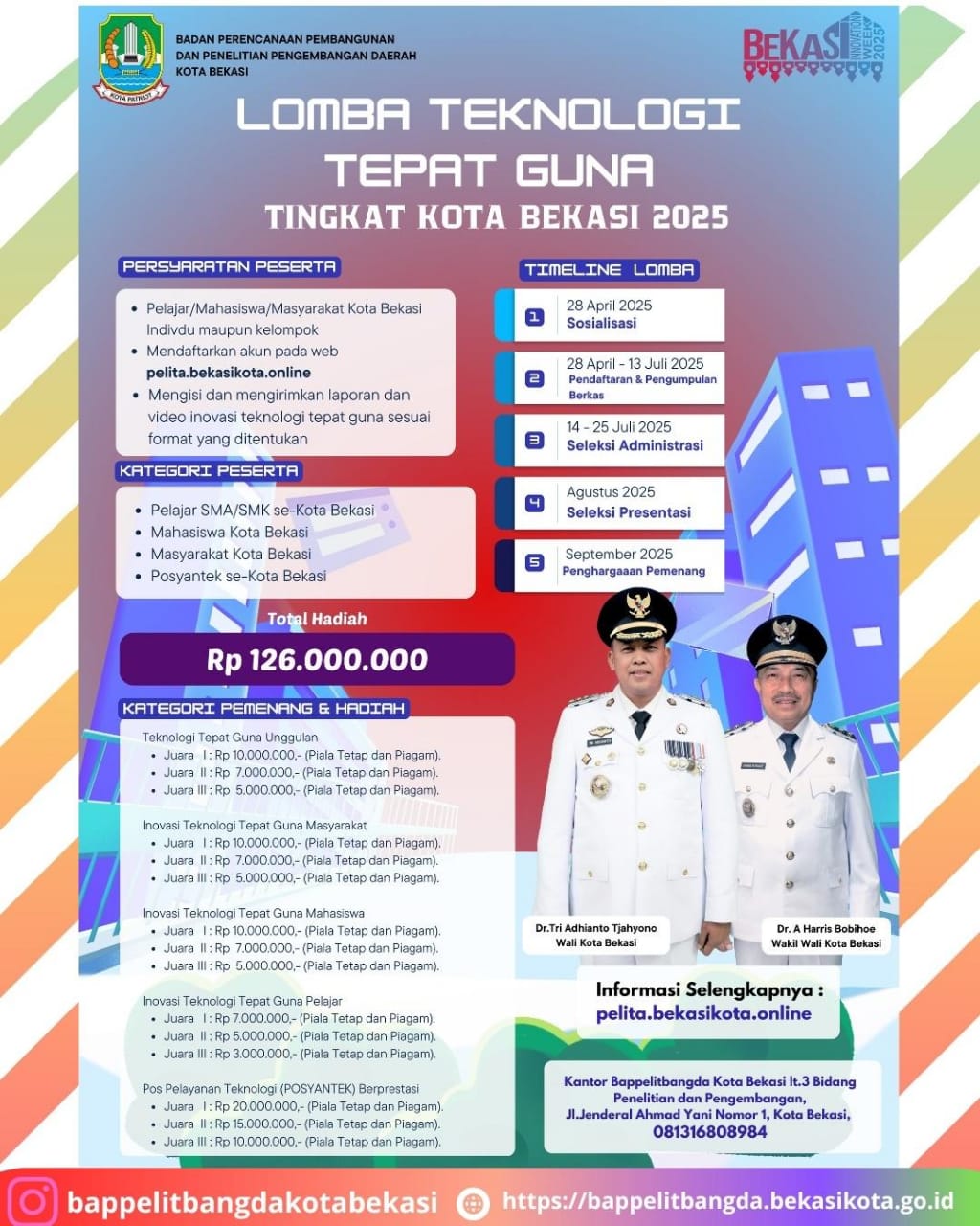 Informasi lebih lengkap terkait Lomba Teknologi Tepat Guna Tingkat Kota Bekasi Tahun 2025 dapat dilihat di pelita.bekasikota.online atau menghubungi Bidang Penelitian dan Pengembangan Bappelitbangda Kota Bekasi lantai 3 Gedung C Komplek Kantor Wali Kota Bekasi, Jalan Jenderal Ahmad Yani Nomor 1 Bekasi, Narahubung : 081316808984.