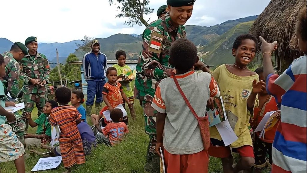 Lanny Jaya – Tak sekedar jago di medan pertempuran, Prajurit Bharata Satgas Yonif MR 412 Kostrad juga piawai dalam menarik simpati anak anak melalui berbagai macam kegiatan yang bermanfaat guna mendukung pola pembinaan teritorial di daerah penugasan pegunungan tengah Lanny Jaya, Papua. Senin (10/01/2022).