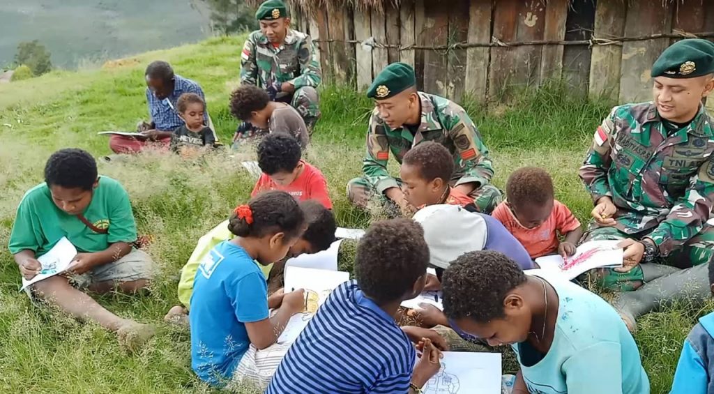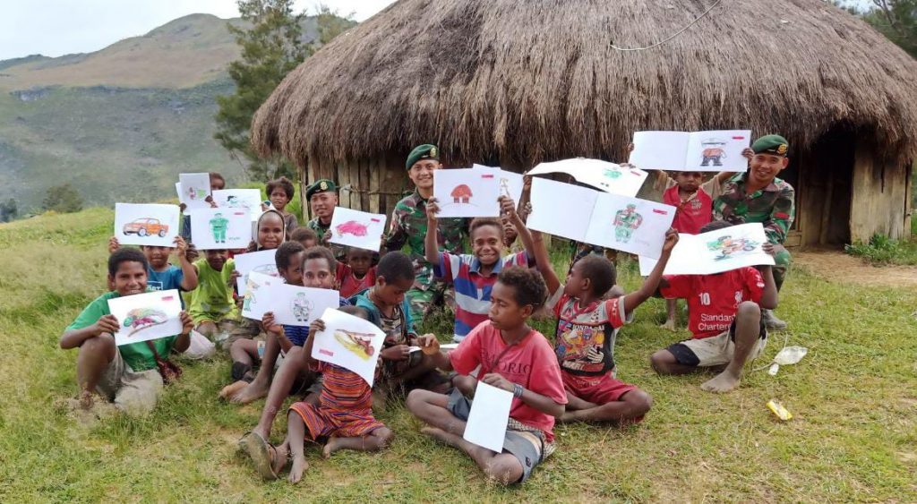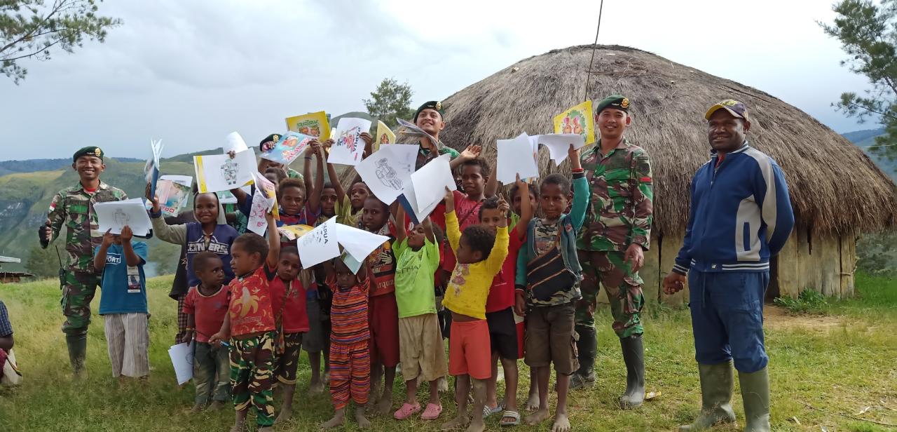 Kesempatan kali ini ditunjukkan oleh anggota Satgas Pos Tiom dengan mengajak anak-anak Kampung Ninabua Distrik Jiginua untuk bermain dan mewarnai lukisan di kertas gambar, dengan duduk beralaskan rumput, sore itu nampak suasana senang dan ceria terpancar dari raut wajah anak-anak yang lagi asyik mewarnai.