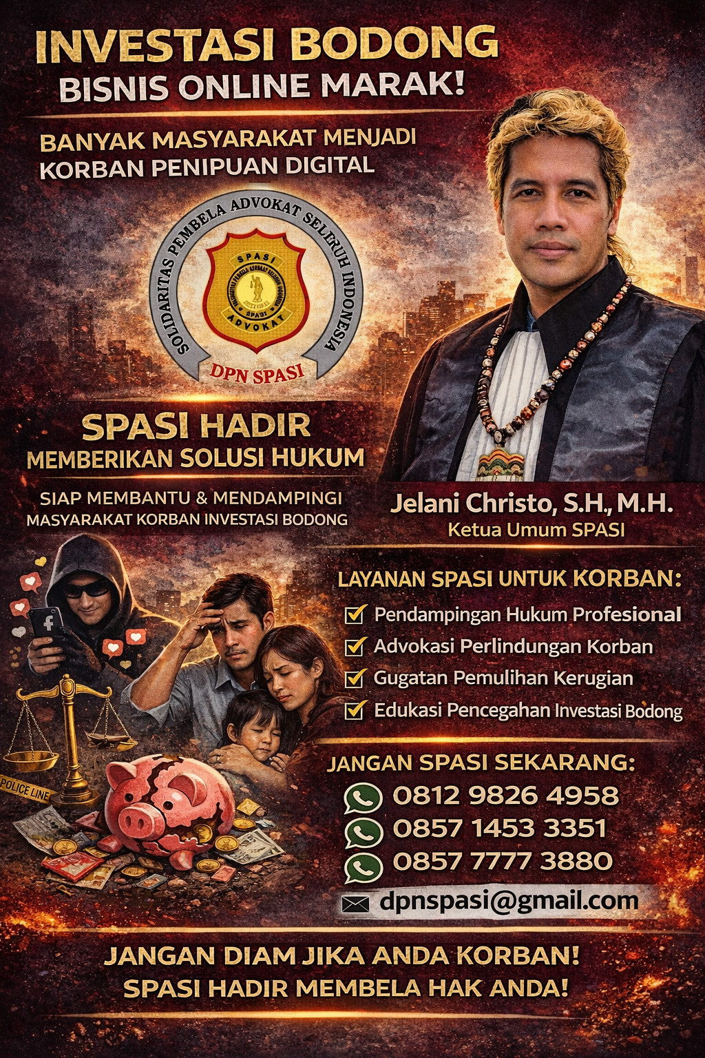 Ketua Umum SPASI, Jelani Christo, S.H., M.H., mengatakan penipuan investasi online saat ini berkembang semakin kompleks dan sulit dideteksi oleh masyarakat awam.