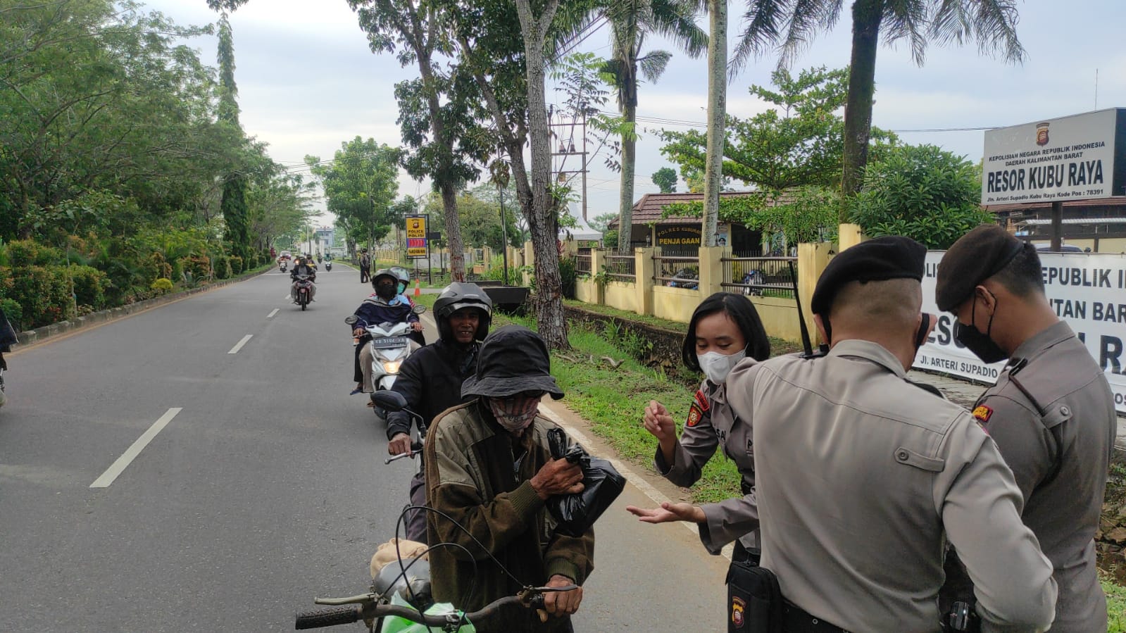 Kubu Raya-Personil Samapta Polres Kuburaya melaksanakan pembagian takjil kepada masyarakat penguna jalan Selasa 12 April 2022 Sekitar jam 16.00 wib sampai dengan selesai.