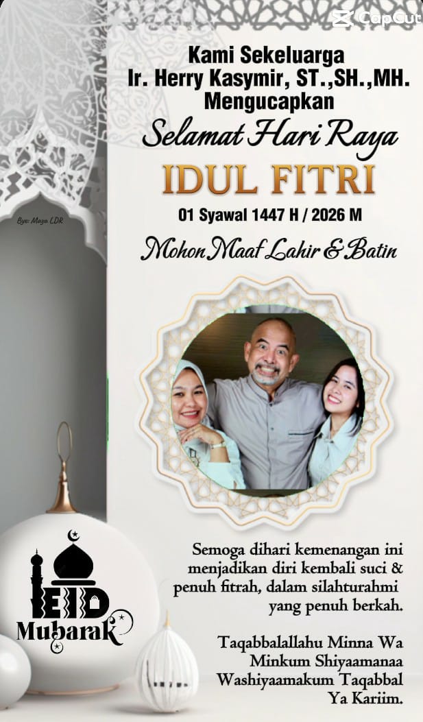Lebih lanjut Ir. Herry Kasymir, ST.,SH.,MH bersama keluarga mengucapkan” Selamat Hari Raya Idul Fitri 1447.H, Mohon Maaf Lahir dan Batin, dengan hati yang tulus saya pribadi bersama keluarga menyampaikan mohon maaf atas segala kesalahan yang pernah terjadi.