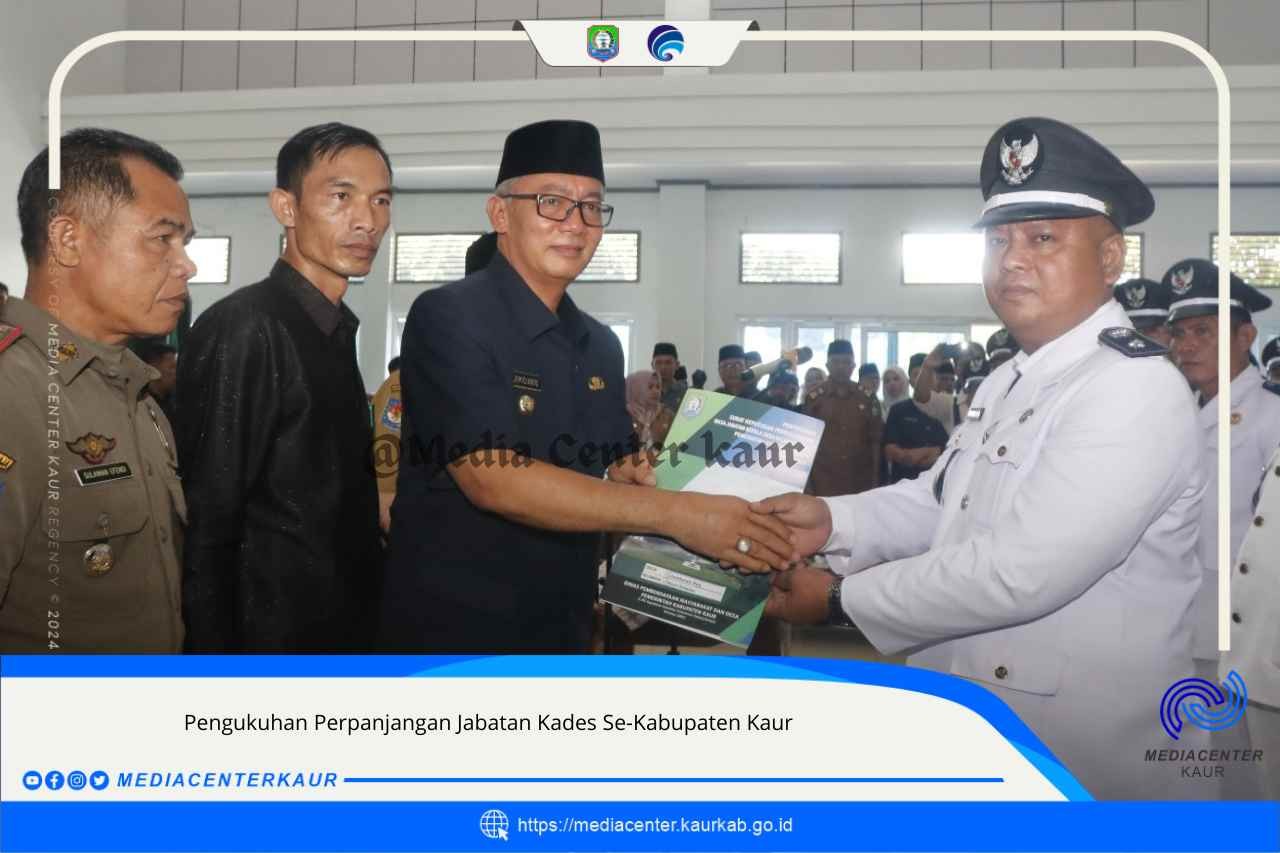Prosesi pengukuhan dan penyerahan surat keputusan (SK) tentang pengesahan masa jabatan kades dilakukan di gedung Serbaguna padang kempas, Senin (8/7/2024)oleh Bupati Kaur H. Lismidianto, SH, MH didamping Sekda Dr. Drs Ersan Syahfiri, MM, Asisten I Bidang Pemerintahan dan Kesra Drs. Sinarduddin dan Kepala dinas PMD Suhadi, ST