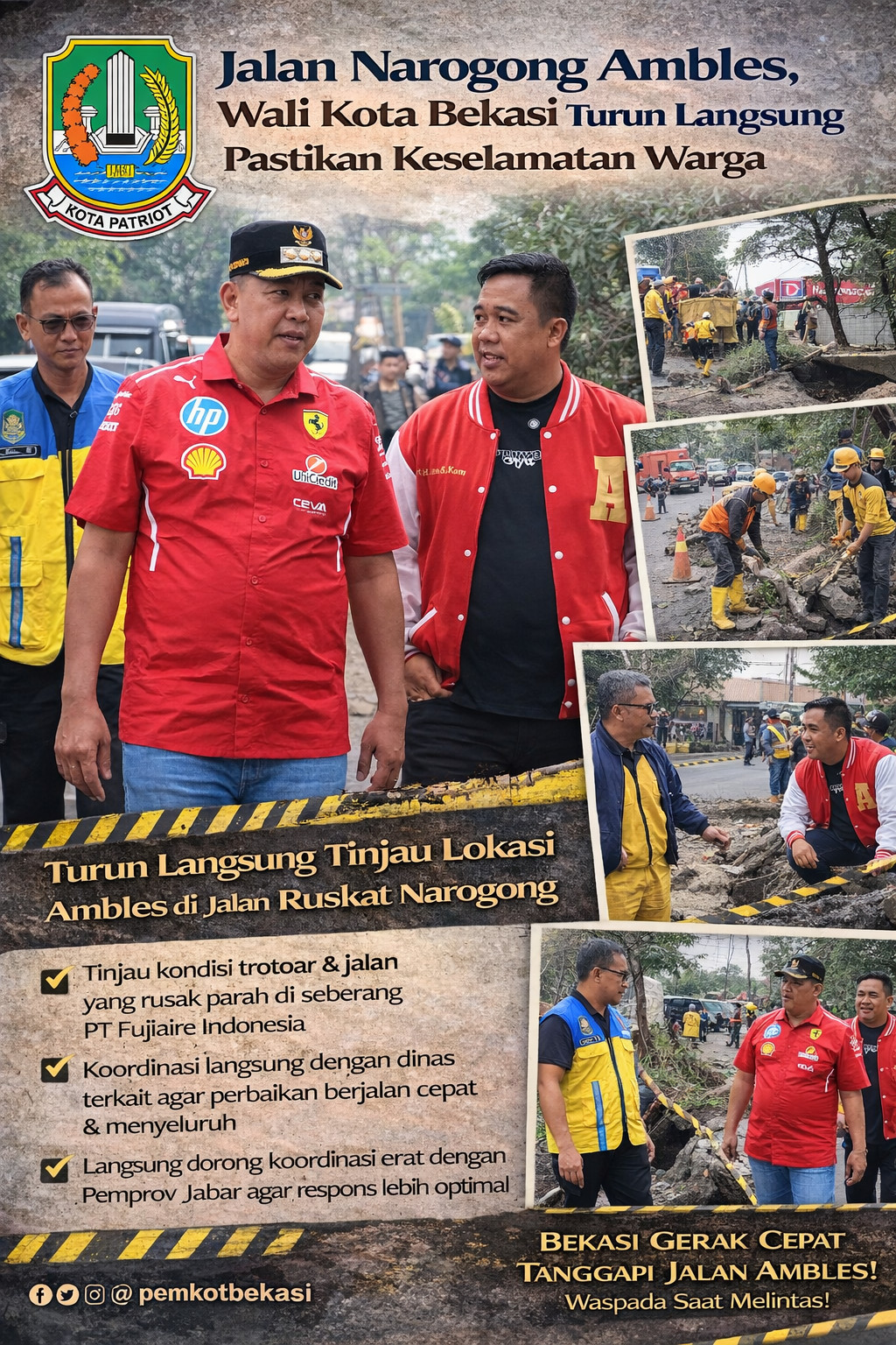 Kota Bekasi — Kerusakan jalan dan trotoar di Jalan Narogong yang mengalami ambles mendapat perhatian langsung dari Wali Kota Bekasi, Tri Adhianto. Meski ruas jalan tersebut berada di bawah kewenangan Pemerintah Provinsi Jawa Barat, Tri memilih turun ke lapangan untuk memastikan penanganan berjalan cepat dan risiko kecelakaan dapat ditekan.