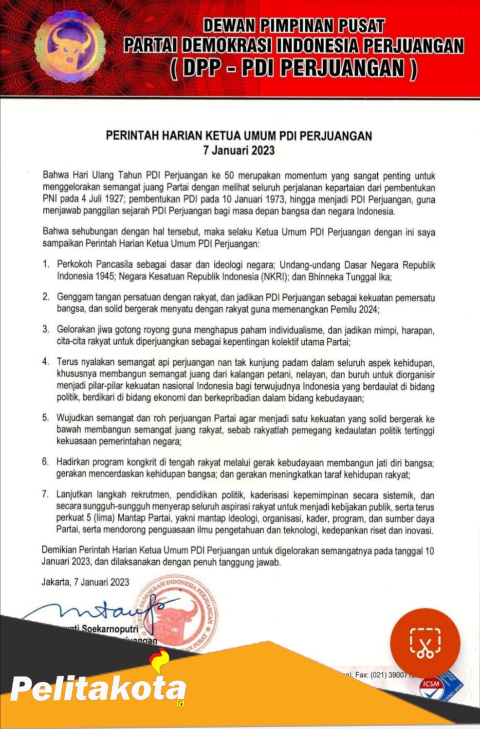 Jakarta – PK NEWS Ketua Umum DPP PDI Perjuangan (PDIP) Prof.Dr. (HC) Megawati Soekarnoputri mengeluarkan surat perintah harian jelang perayaan HUT ke-50 partai pada 10 Januari 2023.