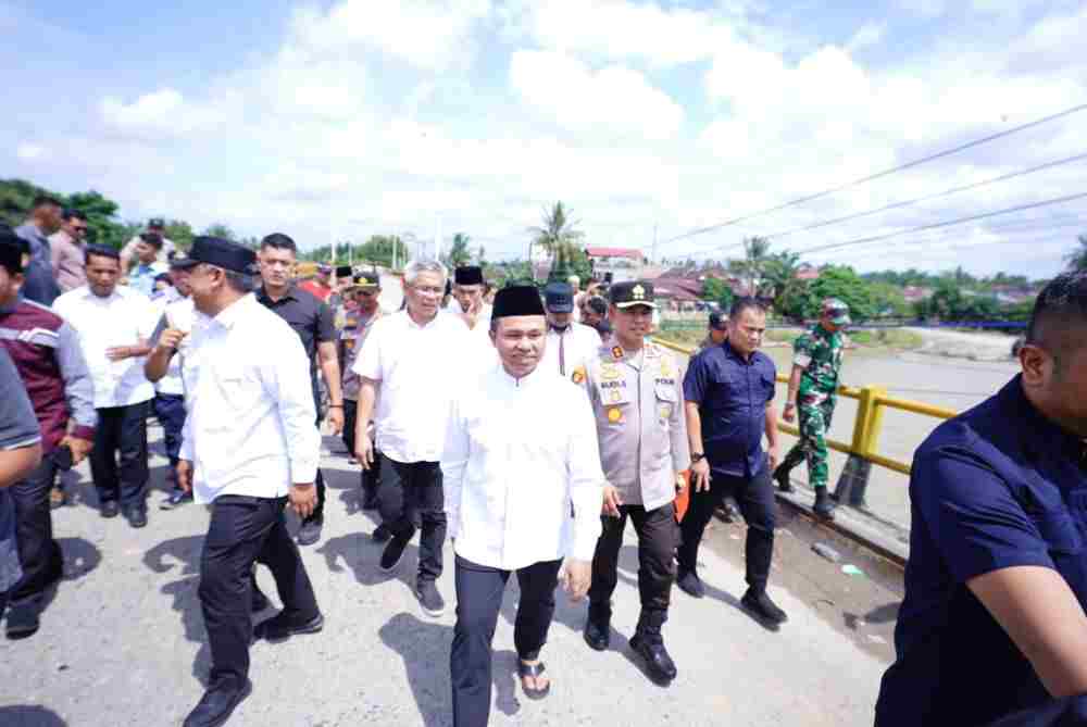 Rohul – Gubernur Riau (Gubri) Abdul Wahid meninjau kondisi Jembatan Sungai Rokan di Desa Sukadamai, Kecamatan Ujung Batu, Kabupaten Rokan Hulu (Rohul), pada Minggu (9/3/2025). Kunjungan ini dilakukan untuk melihat langsung dampak pergeseran struktur jembatan akibat arus sungai yang deras.