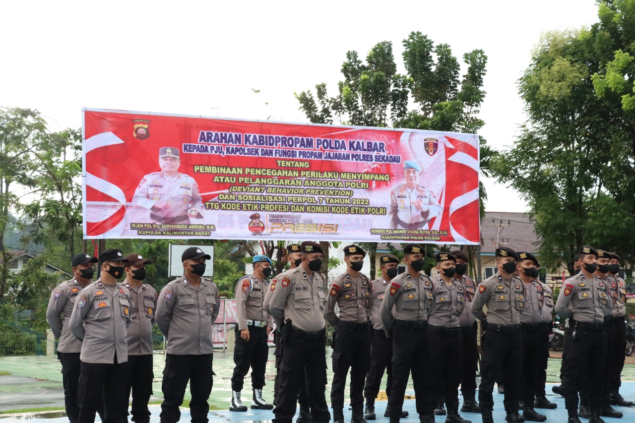 Sekadau – Kabid Propam Polda Kalbar Kombespol Andree Ghama Putra, S.H, S.I.K beserta rombongan tiba di Mapolres Sekadau dalam rangka asistensi dan mitigasi pembinaan perilaku menyimpang atau pelanggaran anggota Polri (deviant behaviour prevention).