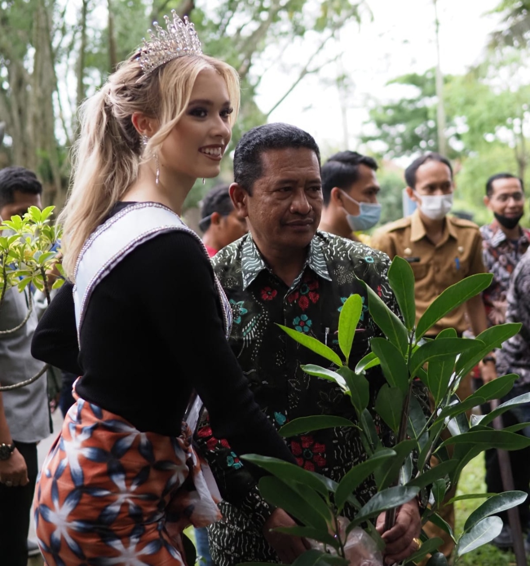TULUNGAGUNG – Miss Universe Switzerland bersama Forkompimda melaksanakan kegiatan menanam pohon langka di area halaman Pendopo Kongas Arum Kusumaning Bongso Tulungagung Jawa Timur, Selasa (22/11/2022).