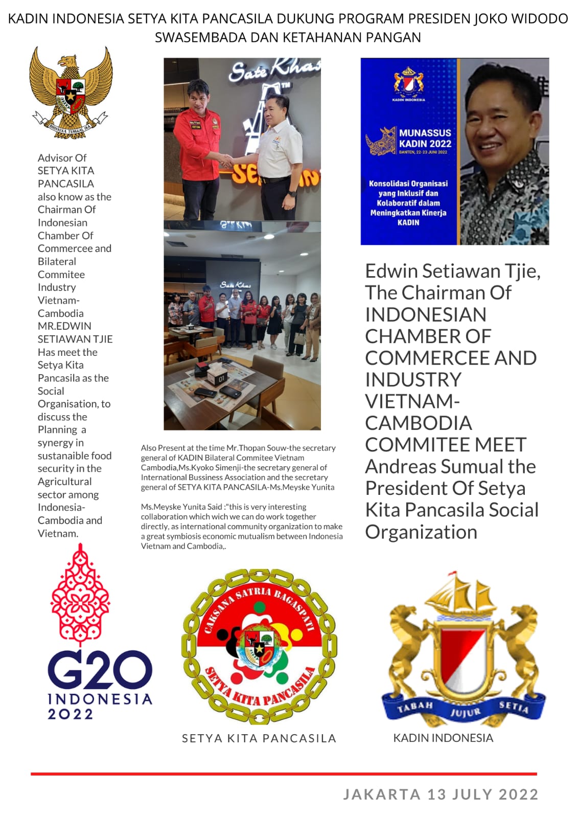 Jakarta – Penasihat SETYA KITA PANCASILA juga dikenal sebagai Ketua Kamar Dagang dan Industri Indonesia – Komite Bilateral Vietnam, Kamboja, Bapak Edwin Setiawan Tjie telah bertemu dengan Organisasi Massa Nasional SETYA KITA PANCASILA untuk membahas dan merencanakan sinergi Ketahanan Pangan yang berkelanjutan di sektor pertanian antara Indonesia, Vietnam dan Kamboja : Turut hadir dalam pertemuan tersebut Mr. Thopan Souw – sekjen KADIN Bilateral Committee Vietnam Kamboja, Ms. Kyoko Simenji – sekjen International Business Association dan sekjen SETYA KITA PANCASILA – Ms. Meyske Yunita.