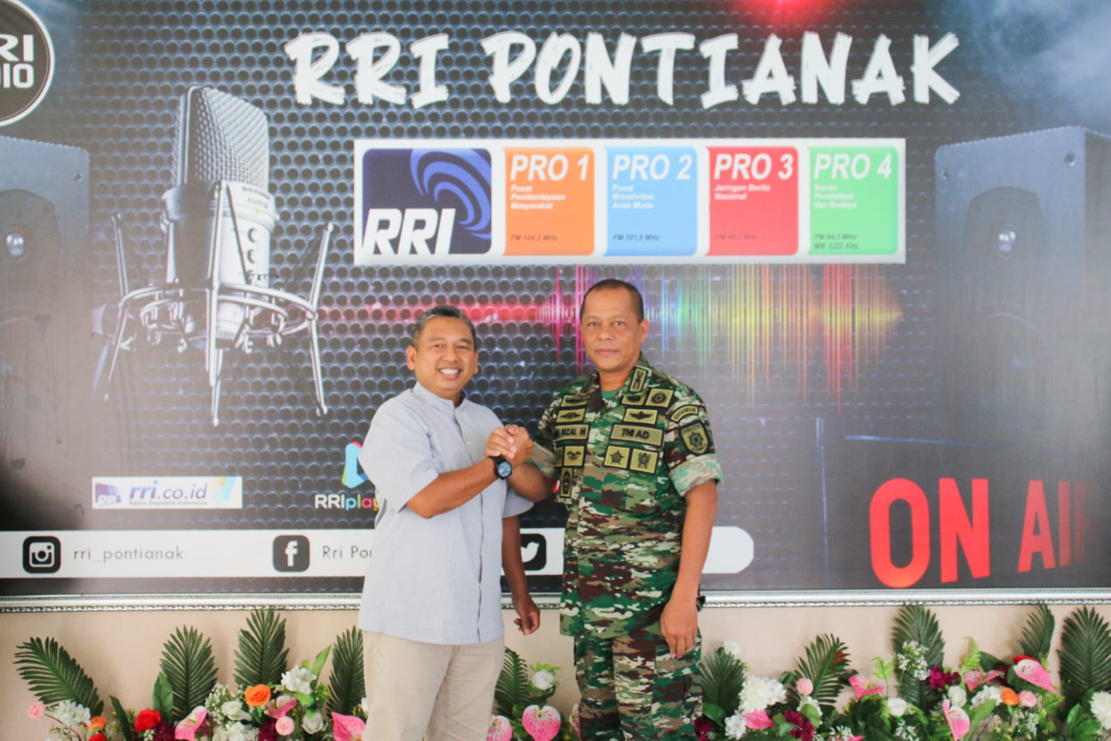 Kapendam XII/Tpr Kolonel Inf Ade Rizal Muharram didampingi Wakapendam XII/Tpr Letkol Arh Suherman, serta para Perwira lainnya disambut hangat oleh Kepala RRI Pontianak, Widhie Kurniawan, SH., yang juga didampingi beberapa stafnya.