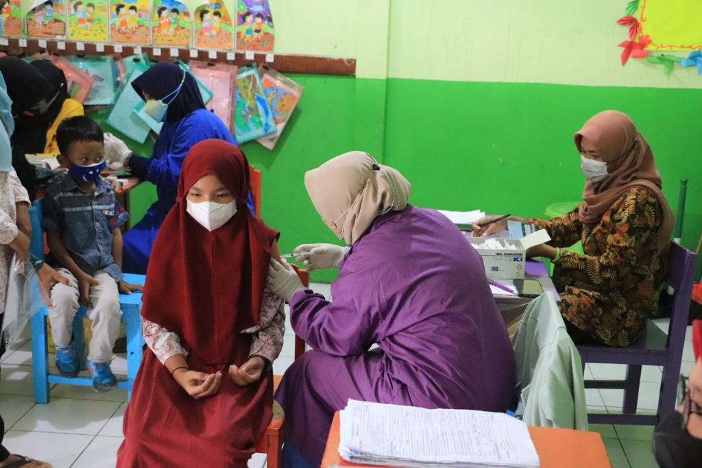 Yogyakarta – Siswa SD Bleber, Sumberharjo, Prambanan, Sleman mengikuti vaksinasi Covid 19 yang digelar secara serentak di seluruh Indonesia . Kegiatan tersebut ditinjau langsung oleh Presiden RI yang didampingi Kapolri melalui zoom meeting pada Kamis (17/2/2022).