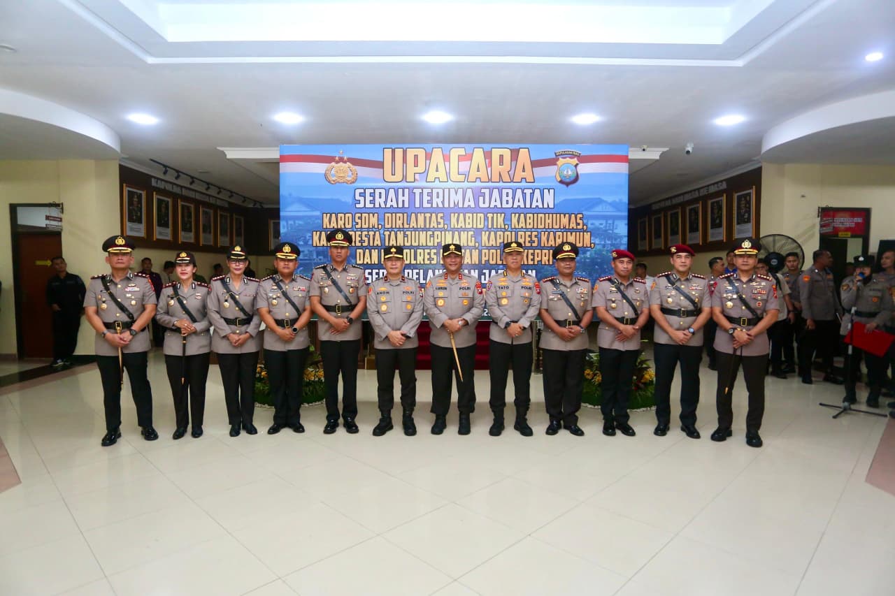 PELITAKOTA.ID: Batam, Kepri — Kapolda Kepulauan Riau Irjen. Pol. Asep Safrudin, S.I.K., M.H., memimpin upacara Serah Terima Jabatan (Sertijab) sejumlah pejabat utama di lingkungan Polda Kepri, meliputi Karo SDM, Dirlantas, Kabid TIK, Kabidhumas, Kapolresta Tanjungpinang, Kapolres Karimun, dan Kapolres Bintan. Selain itu, turut dilaksanakan pelantikan jabatan Dirreskrimum dan Dirresnarkoba Polda Kepri. Kegiatan tersebut berlangsung di Lobby Utama Polda Kepri, Rabu (7/1/2026).