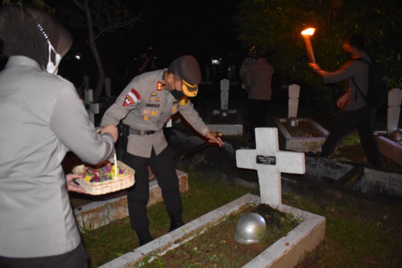 “Baru Sekitar pukul 22.10 Wib dilaksanakan upacara renungan suci di areal makam pahlawan Dharma Patria Jaya dengan diikuti personil RO SDM Polda Kalbar, Adapun selaku Inspektur Upacara yakni Bapak .Kapolres Kubu Raya AKBP JERROLD H.Y KUMONTOY,S.IK,M.Si dan komandan Upacara kabag SDM Kompol B. Sembiring, S.H“