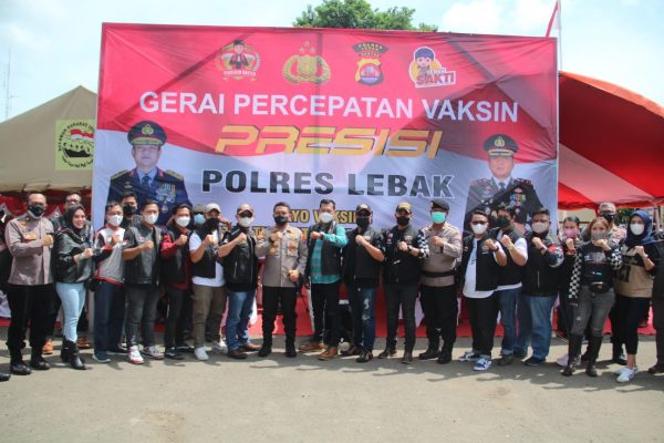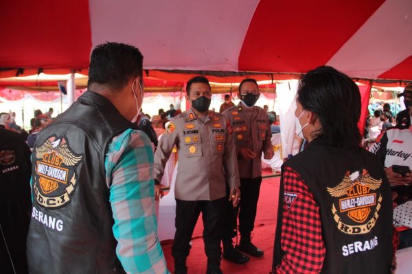 Lebak – Polres Lebak Polda Banten bersama HDCI ( Harley Davidson Club Indonesia ) Serang adakan giat Bakti Sosial (Baksos) Vaksinasi dan Bantuan sembako ke warga di Mapolsek Rangkasbitung, Jalan RT Hardiwinangun No. 77 Kelurahan Muara Ciujung Timur, Kecamatan Rangkasbitung, Kabupaten Lebak. Sabtu (19/3/2022).