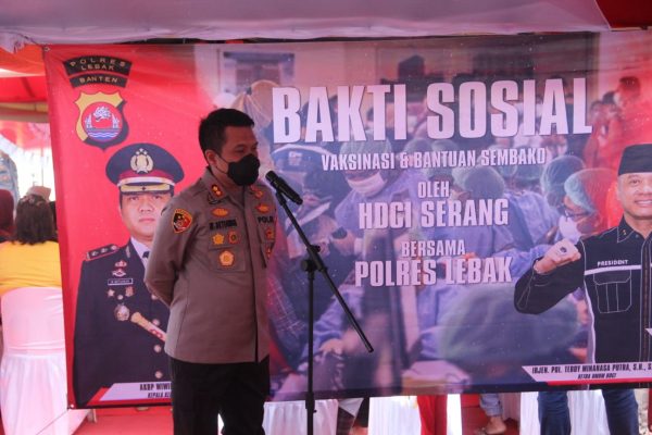 Dalam kesempatan tersebut Kapolres Lebak Polda Banten AKBP Wiwin Setiawan,SIK,M.H. bersama perwakilan HDCI serang Ari Permono menyerahkan bantuan Paket sembako kepada warga peserta vaksinasi sebanyak 500 paket.