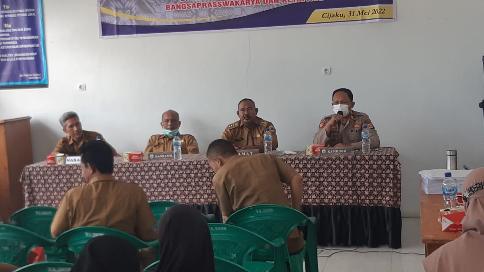 Lebak – Kapolsek Cijaku Polres Lebak AKP Kasih Suparja menghadiri sosialisasi panduan teknis operasional teknis (PTO) Perbub Nomor 21 Tahun 2021 pengadaan Barang Dan Jasa Bangsarprasarana tahun 2022 serta Ketahanan Pangan tahun 2022 di aula Kecamatan Cijaku Kabupaten Lebak, Selasa (41/5/2022) pukul 08.00 WIB.