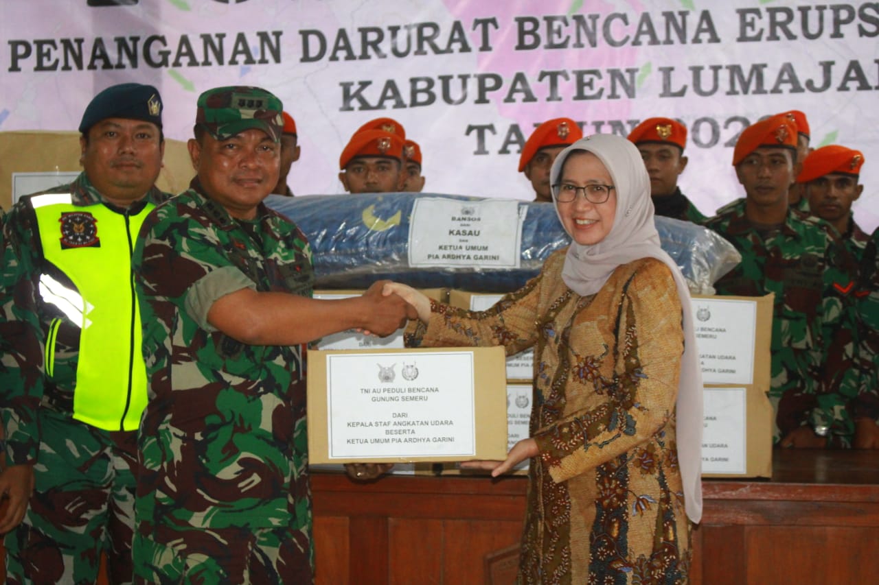 Bantuan dari Kepala Staf Angkatan Udara dan Ketua Umum Pia Ardhya Garini secara simbolis diterima langsung oleh Wakil Bupati Kabupaten Lumajang Ir. Hj. Indah Amperawati Masdar, M.Si yang mengucapkan terima kasih atas bantuan untuk masyarakat yang terdampak erupsi gunung Semeru.