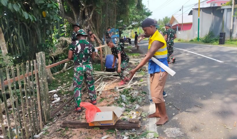 Maluku Utara – Personil Pos Ramil Soatobaru SSK III Satgas Kodim Maluku Utara Yonif RK 732/Banau melaksanakan kegiatan bersama masyarakat membuat Pagar di Desa Samuda…