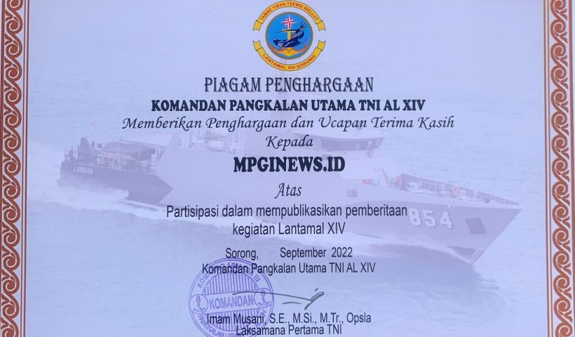 Selengkapnya... Kali Ini Media Mpginews.id Diganjar Piagam Penghargaan Dari Komandan Pangkalan Utama TNI AL XIV Sorong Papua