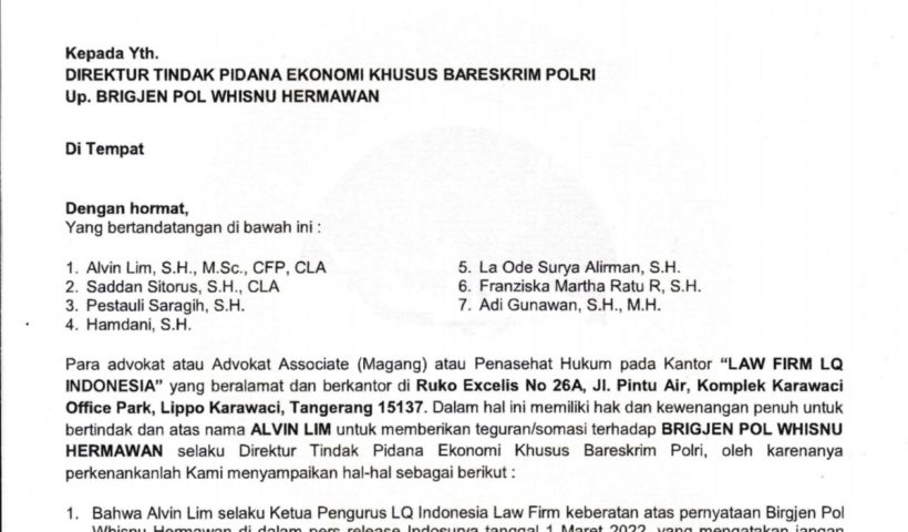 Jakarta – Hari ini LQ Indonesia Lawfirm secara resmi mengirimkan surat Somasi Pertama kepada Jenderal Bintang 1 Mabes POLRI, Brigjen Whisnu Hermawan, atas dugaan perbuatan…