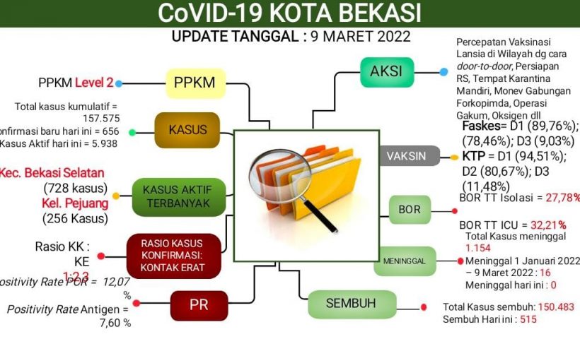 Kota Bekasi – Dinas Kesehatan Kota Bekasi mengeluarkan update laporan perkembangan Covid-19 Kota Bekasi per tanggal 9 Maret 2022. Kota Bekasi masuk dalam PPKM Level…