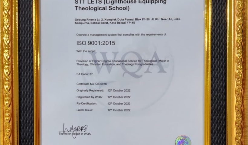 Bekasi, Selasa 14/2 – PK NEWS STT LETS (Lighthouse Equipping Theological School) mendapat Sertifikat ISO 9001:2015 dari badan sertifikasi Internasional Worldwide Quality Assurance (WQA) UK…