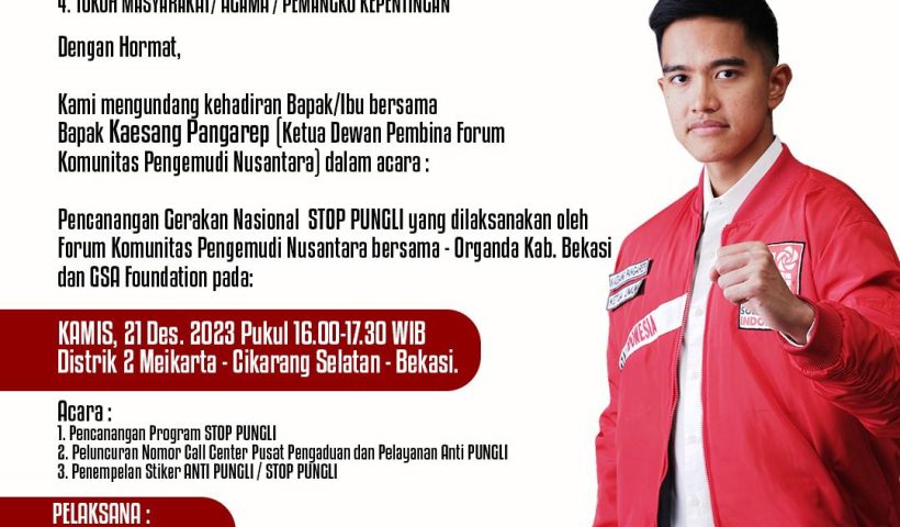 Bekasi -Jabar ||pelitakota.id Kaesang Pengarep Saba Bekasi diundang sebagai Ketua Dewan Pembina oleh Forum Komunikasi Pengemudi Nusantara (FKPN) bersama Organda Kabupaten Bekasi dan GSA Foundation…