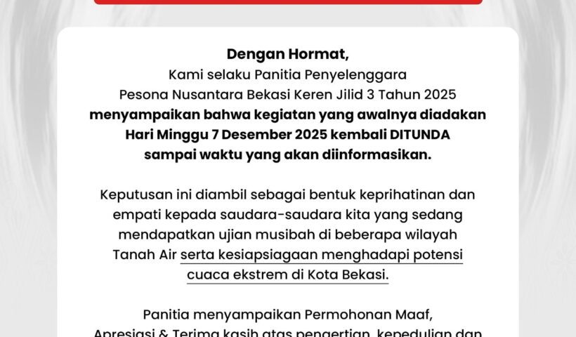 Kamis, 4 Desember 2025 – Acara tahunan yang dinanti-nanti warga Bekasi, Pesona Nusantara Bekasi Keren (PNBK) Jilid 3 Tahun 2025, harus mengundur langkah. Acara yang…