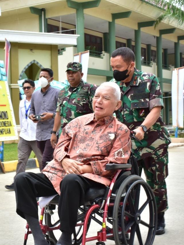 Terlihat Jenderal Bintang Satu yakni Danrem 091/ASN Brigjen TNI Dendi Suryadi SH MH menuntun Bapak Awang Faroek yang berada di atas kursi roda guna menghadiri Musyawarah Kadin Kaltim (Kamar Dagang Indonesia) bertempat di Auditorium Universitas 17 Agustus 1945 Jln Ir. Juanda Samarinda Kaltim. Selasa (5/7/2022).