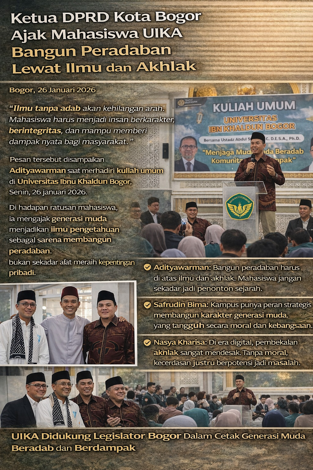 Pesan tersebut disampaikan Adityawarman saat menghadiri kuliah umum di Universitas Ibnu Khaldun (UIKA) Bogor, Senin, 26 Januari 2026. Di hadapan ratusan mahasiswa, ia mengajak generasi muda menjadikan ilmu pengetahuan sebagai sarana membangun peradaban, bukan sekadar alat meraih kepentingan pribadi.