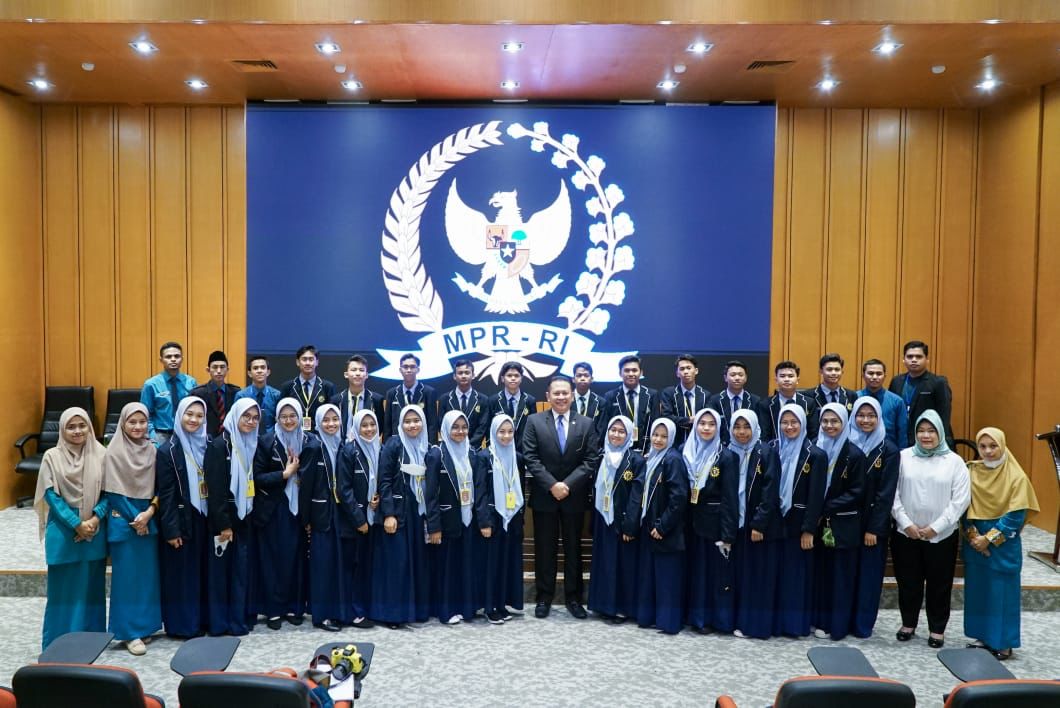 “Konsep tersebut selaras dengan amanat pasal 31 ayat (3) Undang-Undang Dasar Negara Republik Indonesia Tahun 1945 yang menegaskan bahwa dalam rangka mencerdaskan kehidupan bangsa, sistem pendidikan nasional diselenggarakan untuk meningkatkan keimanan dan ketakwaan, serta akhlak mulia. Amanat Konstitusi ini dimaknai, bahwa tujuan penyelenggaraan pendidikan tidak hanya sekedar untuk melahirkan sumberdaya manusia yang cerdas dan terampil saja, tetapi juga berkarakter dan berwawasan kebangsaan. Generasi muda yang berwawasan kebangsaan, adalah generasi yang berhati Indonesia, dan berjiwa Pancasila,” ujar Bamsoet saat menerima kunjungan siswa Kelas XII SMA Pesantren Modern Internasional Dea Malela, Sumbawa, NTB sekaligus Sosialisasi Empat Pilar MPR RI, di Ruang Abdul Muis, Gedung Nusantara, Komplek MPR RI, Jakarta, Senin (9/11/22).