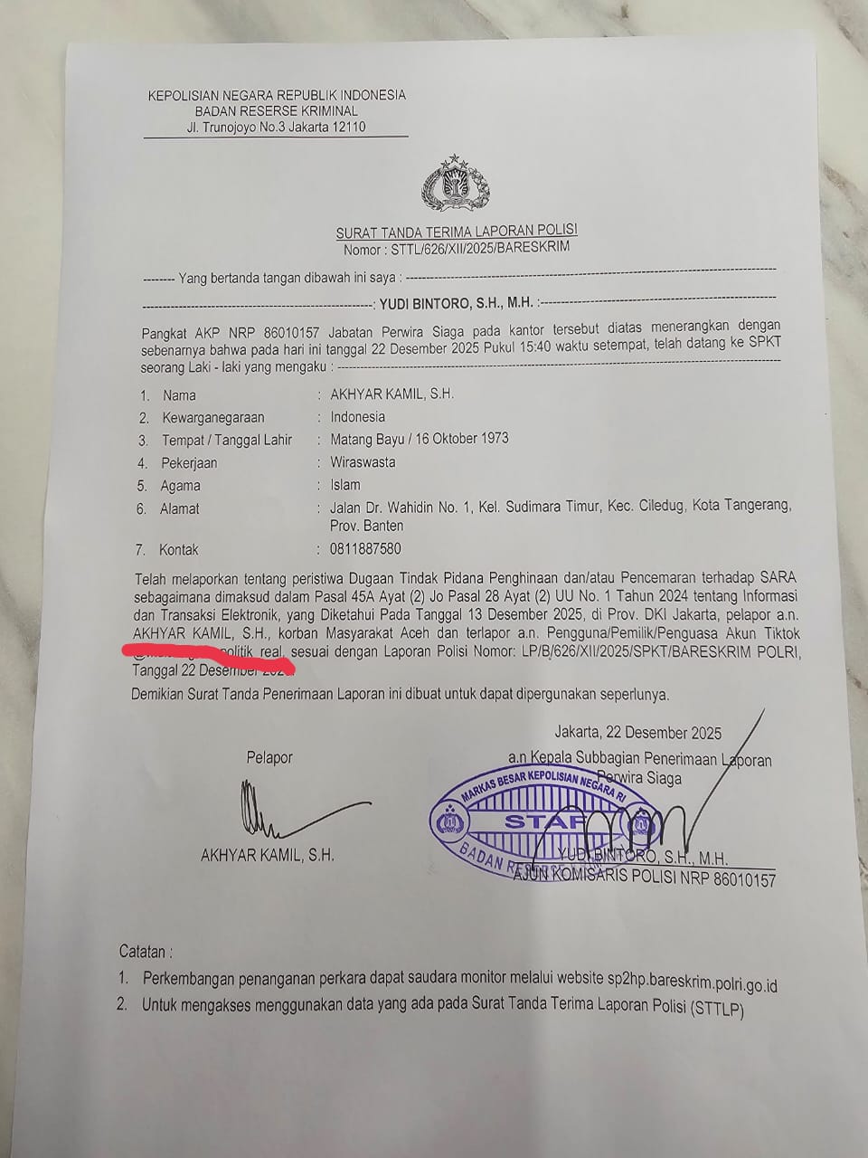 Dr. Emiral Rangga Tranggono,SH., M.H. Selaku Ketua Tim Advokasi Persaudaraan Aceh Seranto, hari ini kami membuat laporan ke Cyber Bareskrim melaporkan dugaan terhadap akun Tik tok Wdagelanpolitik, dengan laporan polisi nomer. L/B/626/XII/2025/SPKT/BARESKRIM POLRI Tanggal 22 Desember 2025.