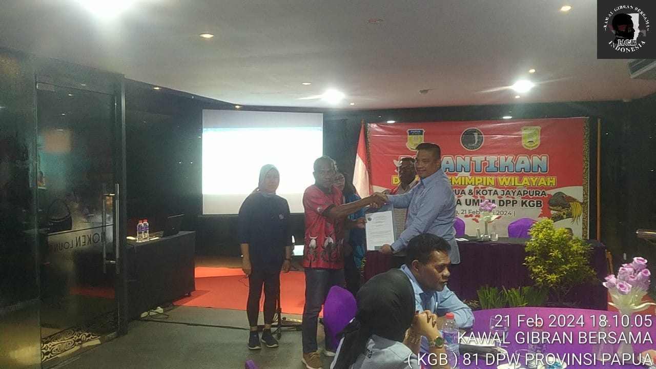 Jayapura, 21 Februari 2024 – Pelitakota.id bertempat Hotel Fox Jayapura telah dilantik kepengurusan Provinsi (DPW) Kawal Gibran Bersama (KGB) oleh Ketum KGB Roman Sibuea