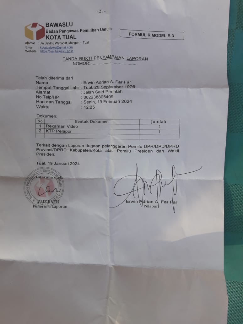Setelah itu pada tanggal 19 Februari 2024, Bawaslu Kota Tual memberikan Tanda Bukti Penyampaian Laporan, dan dalam keterangan tanda bukti menerangkan Laporan baru dibuatkan pada tanggal 19 Februari,padahal sesungguhnya laporan tersebut telah disampaikan pada tanggal 16 Februari 2024. Far-Far menyampaikan mestinya Tanda Bukti Penyampaian Laporan dibuatkan pada saat bersamaan dengan laporan disampaikan. “beta buat laporan tanggal 16 Februari, tanggal 18 Februari baru diambil keterangan secara tertulis dalam Berita Acara dan tanggal 19 Februari diberikan tanda bukti laporan dan seolah-olah beta baru buat laporan tanggal 19 Februari, cara-cara kerja manipulasi seperti ini kan tidak betul, mestinya pada saat itu juga, yaitu tanggal 16 Februari dibuatkan tanda terima laporan dan diberikan ke beta, kerja seperti ini kan melanggar Pasal 13 ayat (5) Perbawaslu No. 7/2022, yaitu : Tanda bukti penyampaian Laporan sebagaimana dimaksud pada ayat (4) diserahkan pada Hari yang sama pada saat Pelapor menyampaikan Laporan”Berselang beberapa waktu kemudian, yaitu tepatnya pada tanggal 27 Maret 2024, Far-Far menyurati Bawaslu Kota Tual, Perihal : Permohonan Informasi Status Penanganan Laporan Pelanggaran Pemilu, dan surat itu diterima oleh staf sekretariat Bawaslu Kota Tual atas nama Ibu Ramlah, berselang 1 (satu) jam kemudian, setelah surat itu disampaikan, Ibu Ramlah mengirim Pemberitahuan Status Laporan, tertanggal 21 Februari 2024, dalam bentuk file pdf melalui pesan whatsaap.