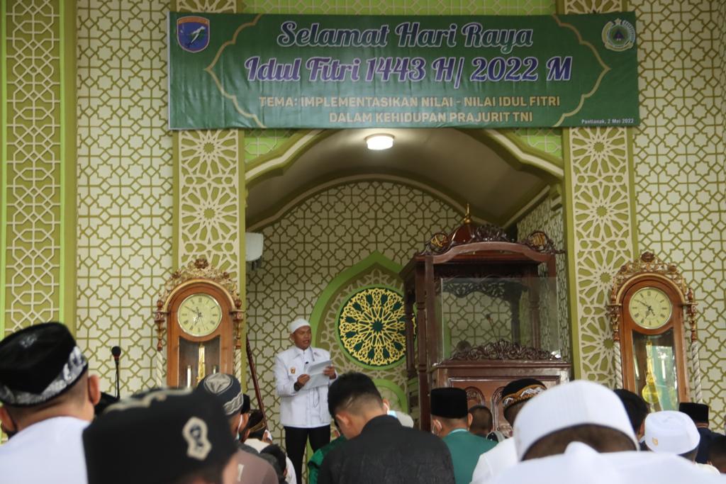 Bertindak selaku imam dan khatib pada Shalat Ied yakni Dr. H. Udi Yulianto, M.A. mengangkat tema, “Implementasikan Nilai-nilai Idul Fitri Dalam Kehidupan Prajurit TNI”.