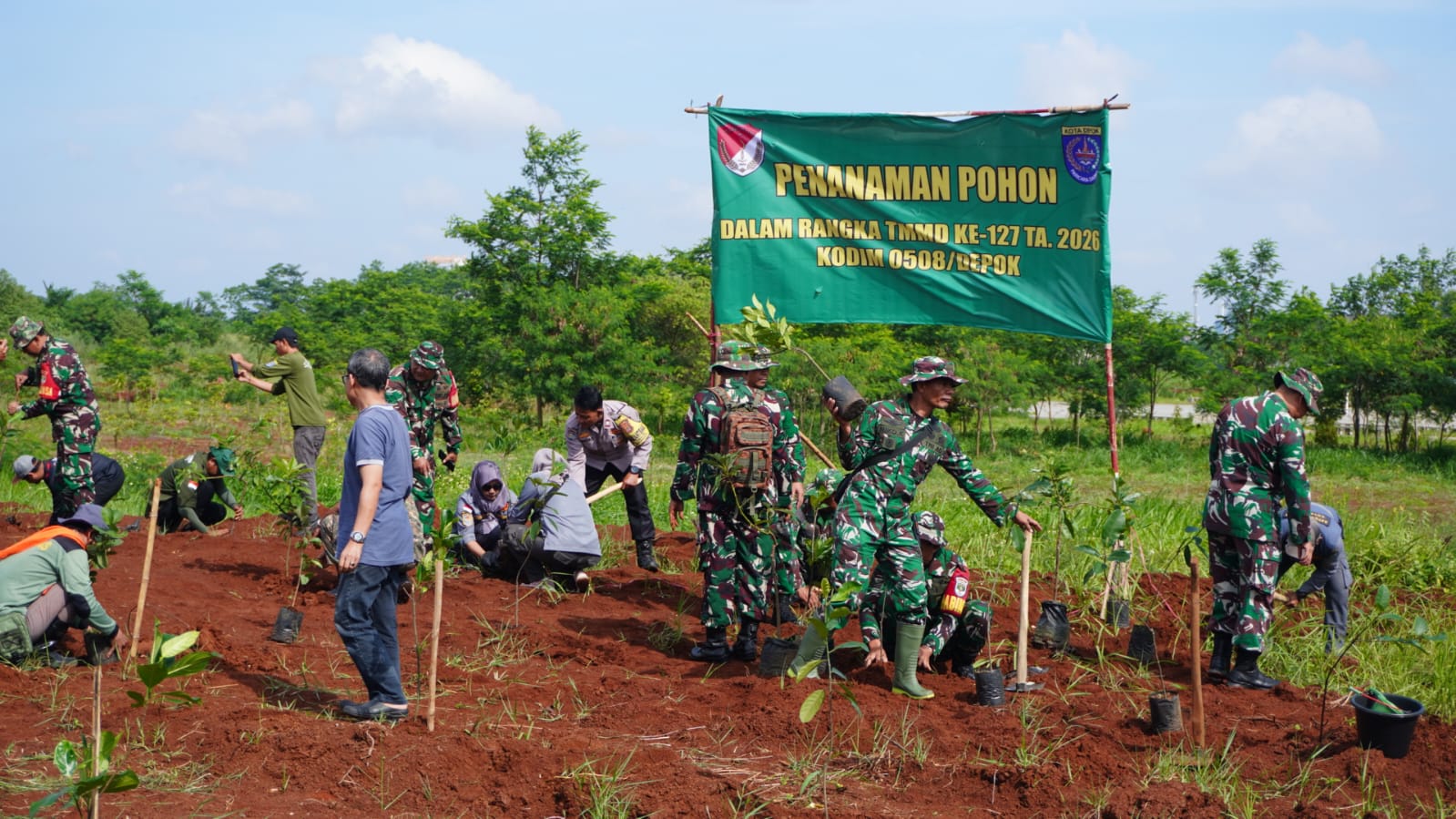 DEPOK – Upaya menjaga kelestarian lingkungan terus dilakukan berbagai pihak. Salah satunya melalui kegiatan penanaman pohon yang dilaksanakan dalam rangka program TNI Manunggal Membangun Desa (TMMD) ke-127 Kodim 0508/Depok.