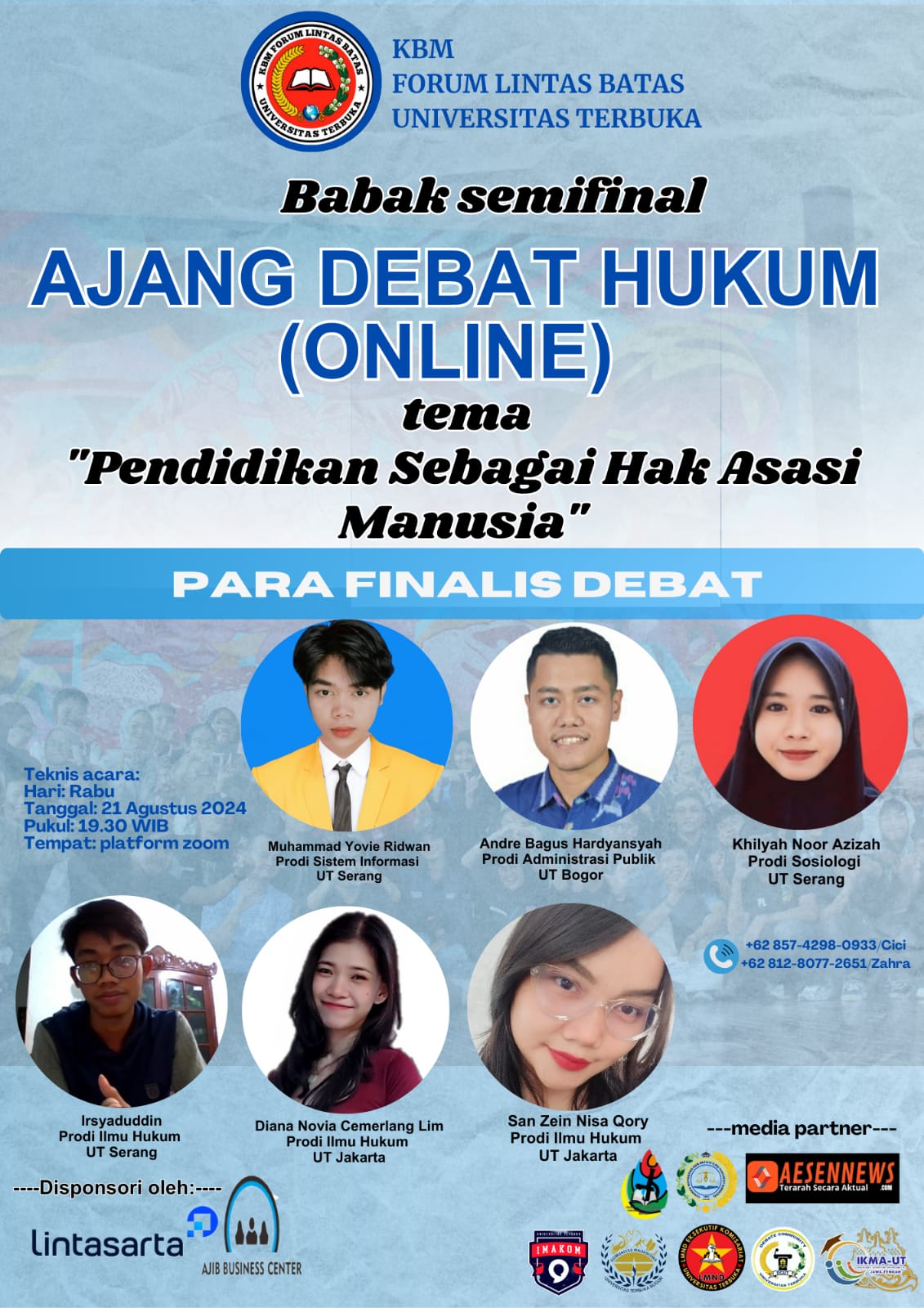 Bogor – Kegiatan produktif Ajang Debat Hukum Online yang diselenggarakan oleh para mahasiswa Universitas Terbuka, dengan tema “PENDIDIKAN ADALAH HAK ASASI MANUSIA”, proses seleksinya sudah dilakukan dari tanggal 11 Agustus 2024 lalu.